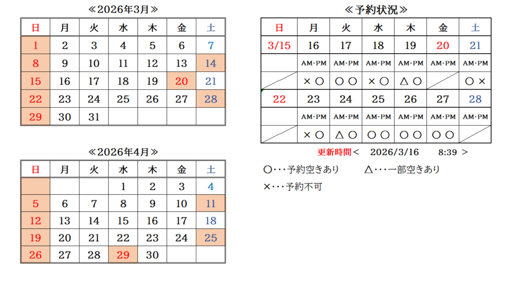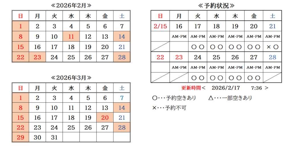 2025年11月1日 / 最終更新日 : 2026年2月17日 kaneman お知らせ 営業日カレンダー<予約状況> 2026年2月・3月のカレンダーを掲載しました。 予約状況につきましては、毎日更新しています。 営業時間は2月27日まで8時~16時までとなります。 ご不便をおかけしますが、何卒よろしくお願い申し上げます。 コメントを残す コメントをキャンセルメールアドレスが公開されることはありません。 ※ が付いている欄は必須項目ですコメント ※ 名前 ※ メール ※ サイト 次回のコメントで使用するためブラウザーに自分の名前、メールアドレス、サイトを保存する。 Δemail confirm* post date* 日本語が含まれない投稿は無視されますのでご注意ください。(スパム対策)
