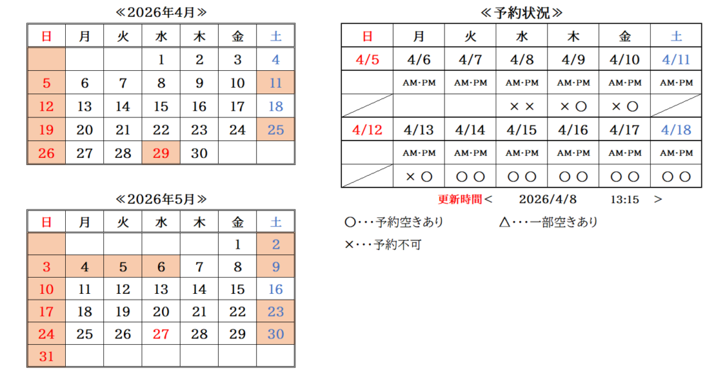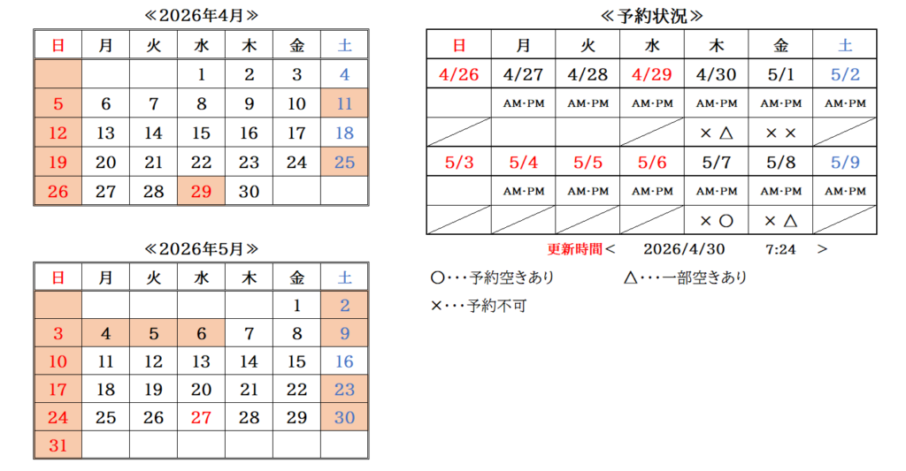 2025年11月1日 / 最終更新日 : 2026年4月30日 kaneman お知らせ 営業日カレンダー<予約状況> 2026年4月・5月のカレンダーを掲載しました。 予約状況につきましては、毎日更新しています。 営業時間は7時45分~16時45分までとなります。 コメントを残す コメントをキャンセルメールアドレスが公開されることはありません。 ※ が付いている欄は必須項目ですコメント ※ 名前 ※ メール ※ サイト 次回のコメントで使用するためブラウザーに自分の名前、メールアドレス、サイトを保存する。 Δemail confirm* post date* 日本語が含まれない投稿は無視されますのでご注意ください。(スパム対策)